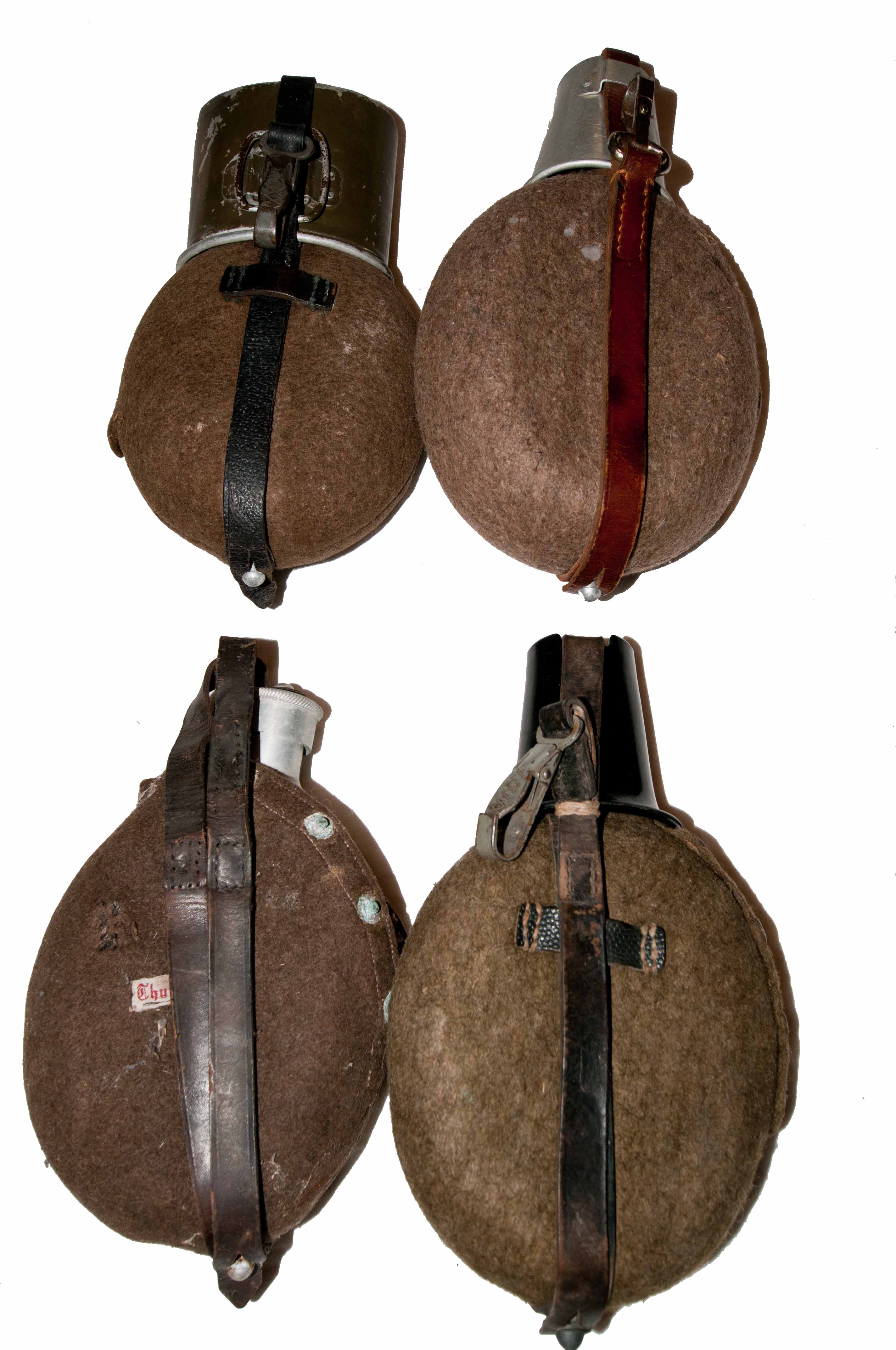 Picture to the right shows different models. Top right is a canteen for the civilian marked, Top left is the standard issue m31 canteen. Bottom right is a early war canteen with black bakelite cup. Bottom left is a prewar named canteen in poor shape. The latter is a reference as it is 100% genuine and original. It was found in a local german artillery festung. Stored poorly it has deteriorated, but nevertheless it is a reference for comparison.