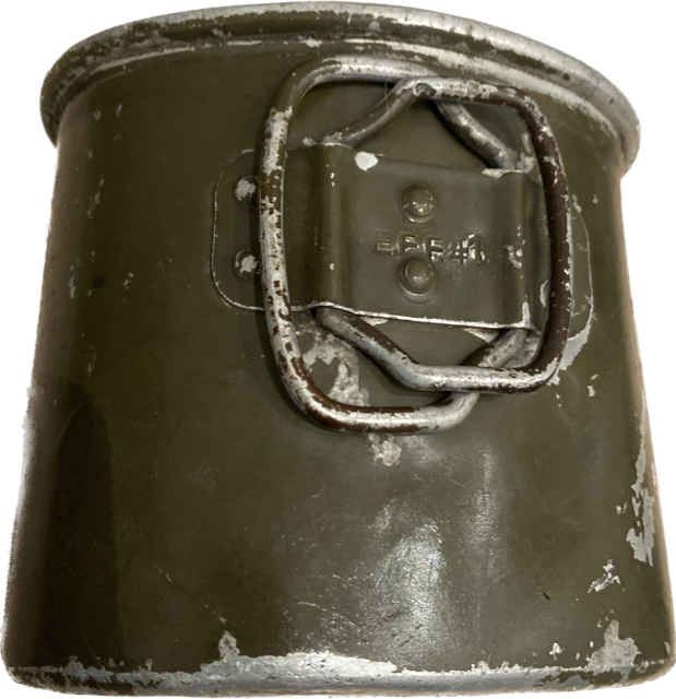Early cups are made of blackpainted aluminium, after 1941 they were ordered to be produced in olive green. Bakelite cups appear during the early stages of the war (a bakelite 41 marked cup further down). As aluminium was a high priority resource for the aviation industri, cups start to appear made of painted steel. The metal cups are not always marked. The screwcaps are made of both aluminium and bakelite, the latter more encountered later. The srewcap are sometimes marked the same as the bottle.
